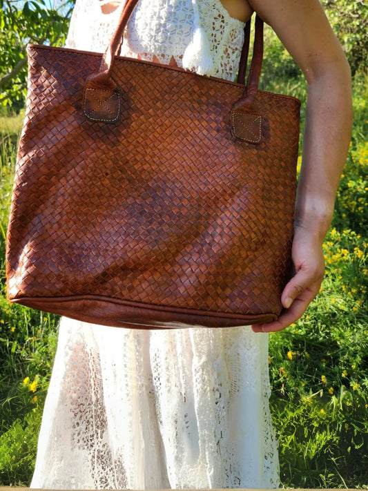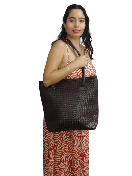 Tote Bag de cuero natural tejido color café – Zafira